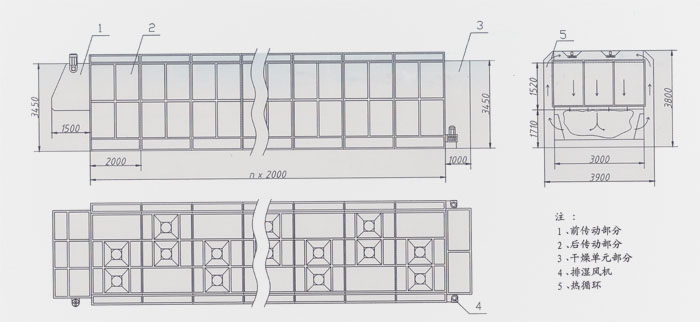 本機由若干2米長的單元組成上下通道,皮張由通道下層輸入,通過上層通道干燥后卸下,每個單元都配有一組加熱裝置,機內共分2-3個溫度段,可根據工藝要求自由選擇控制溫度,其熱機效率高;濕氣排除由安裝在機器尾部的離心風機完成,主傳動配有無極調整裝置。 本機適用羊皮、豬皮、整張牛皮、半張牛皮經鞣制、染色后的掛晾干燥,還適用于真空干燥、噴漿或貼板之后的溫度調節(jié)干燥。